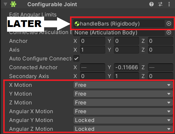 IMPORTANT!! If you haven’t already, we need to create a second config joint for the 2 FRONT wheels, otherwise it won’t work!! Now for the second, we’ll set the Connected Body later, set everything to free EXCEPT Angular Y and Z Motion, set those to locked. And that’s it for the config joints.